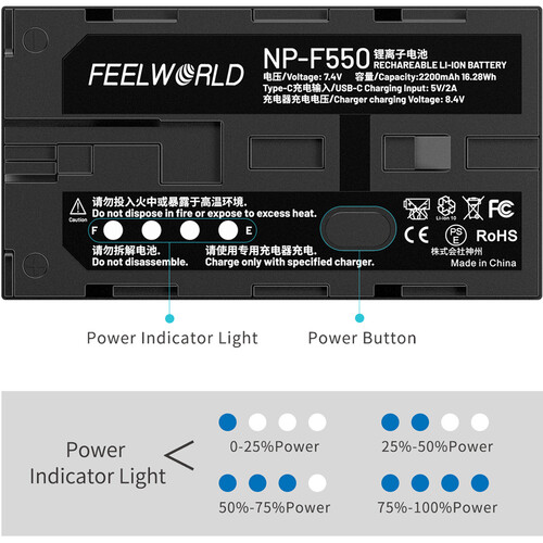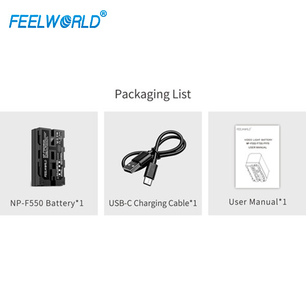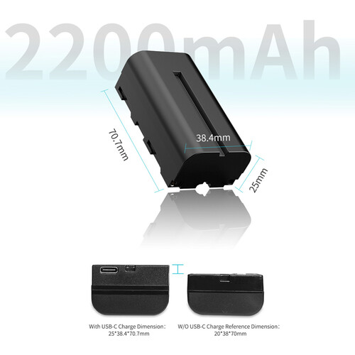 Alimente cualquier luz LED o monitor que use baterías Sony serie L/NP-F con esta batería NP-550 con carga USB-C de FeelWorld . La batería serie L tiene una capacidad de 2200 mAh y proporciona una salida de 7,4 V. Se carga completamente en aproximadamente 2 horas con el cable USB incluido y una fuente de alimentación USB opcional. También se puede cargar con un cargador estándar serie L/NP-F.