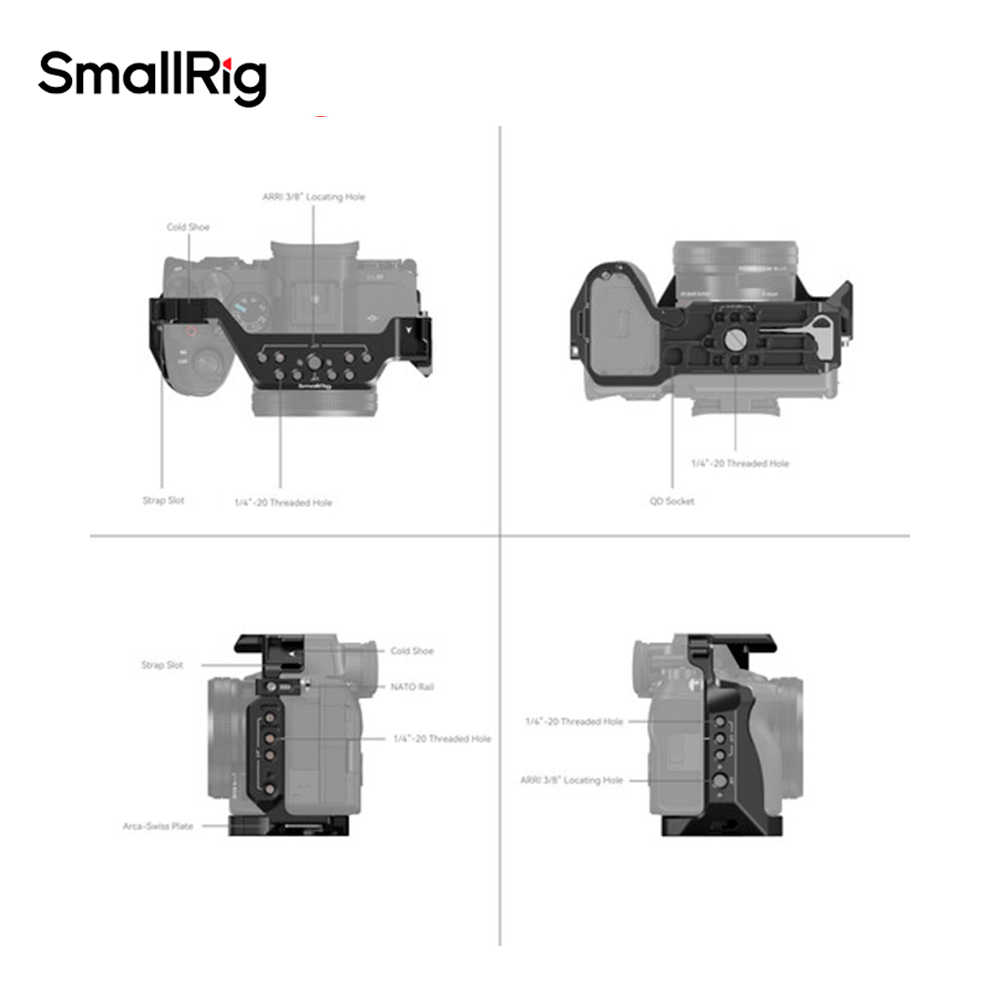 Varias roscas de 1/4″-20 y roscas ARRI anti-torsión de 3/8″-16 en toda la jaula ofrecen puntos de montaje para brazos articulados. Dos zapatas frías y un riel NATO permiten acoplar transmisores inalámbricos, luces de relleno o asas laterales. La base de la jaula incorpora una placa de liberación rápida tipo Arca para facilitar su integración en un trípode o estabilizador. Su construcción en aleación de aluminio y acero inoxidable crea un diseño duradero y ligero, y las almohadillas de goma en el interior protegen la cámara de arañazos.