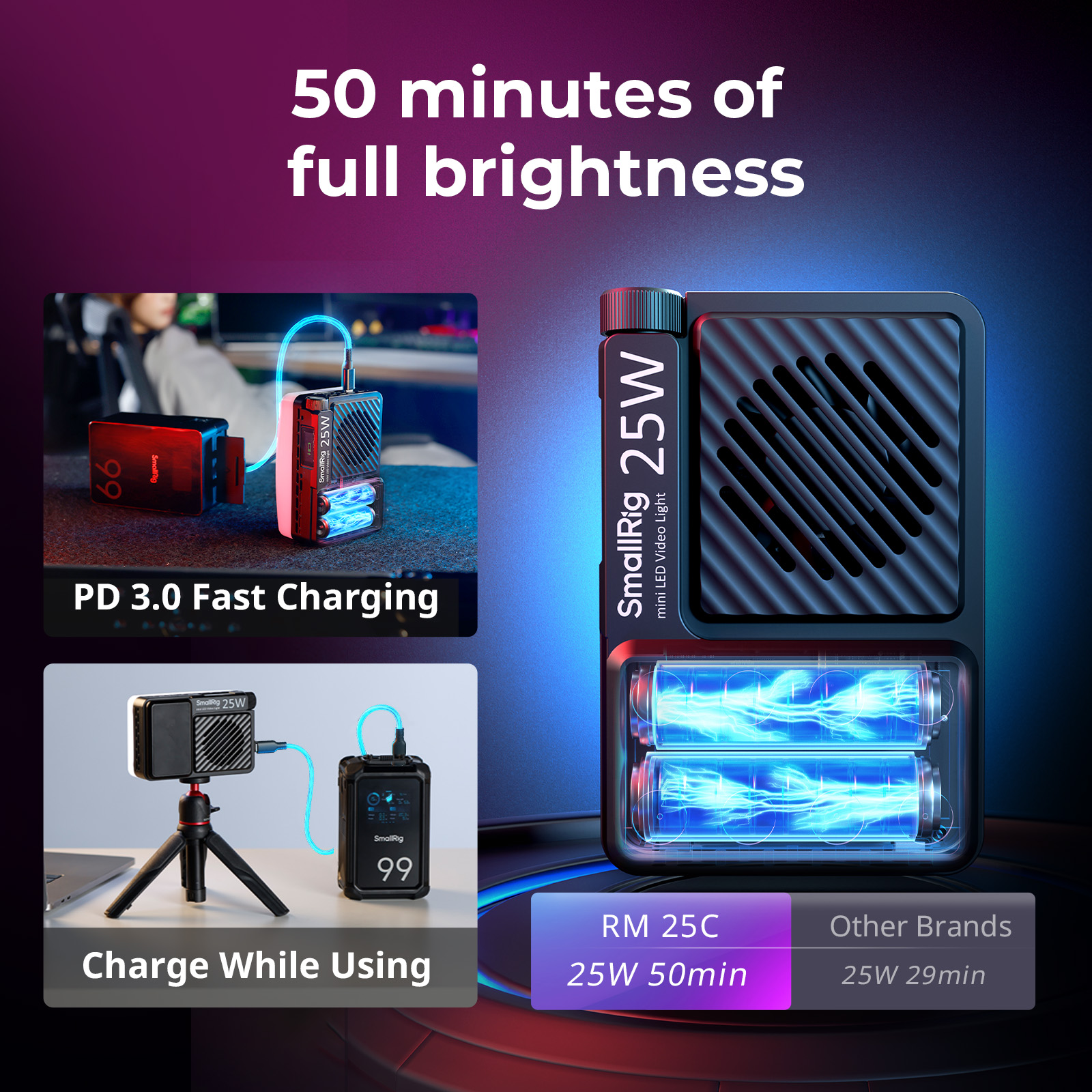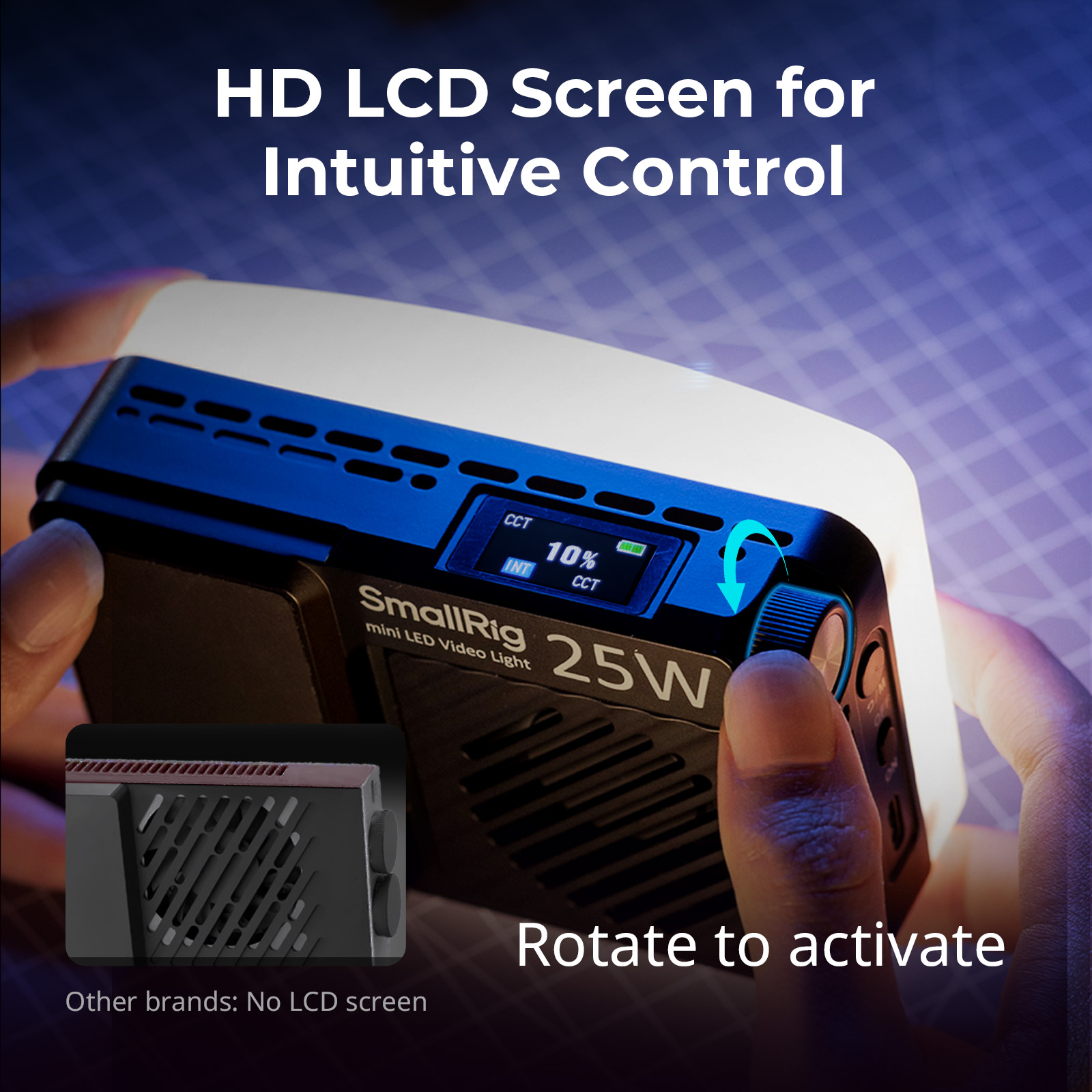 Una pantalla LCD integrada permite controlar el brillo, la temperatura de color y la duración de la batería. La luz cuenta con un diseño de montaje magnético para fijarla a superficies metálicas. También cuenta con una rosca de 1/4″-20 en la parte inferior para su fijación a un brazo articulado. La batería integrada de 3100 mAh mantiene la luz funcionando al 100 % de brillo durante 50 minutos. Una entrada USB-C PD recarga la batería a más del 80 % en solo 45 minutos. Un difusor incluido ayuda a lograr una iluminación más suave.