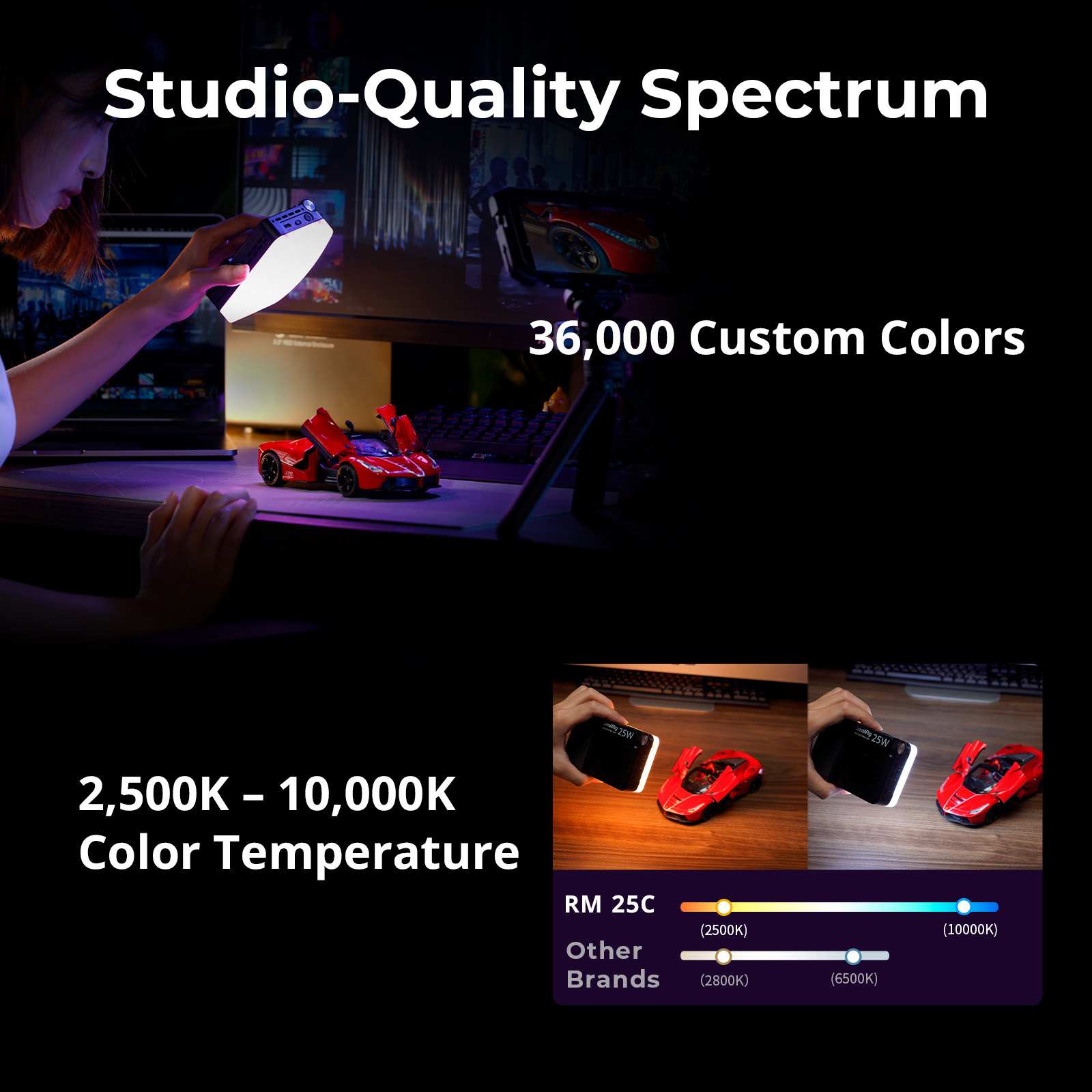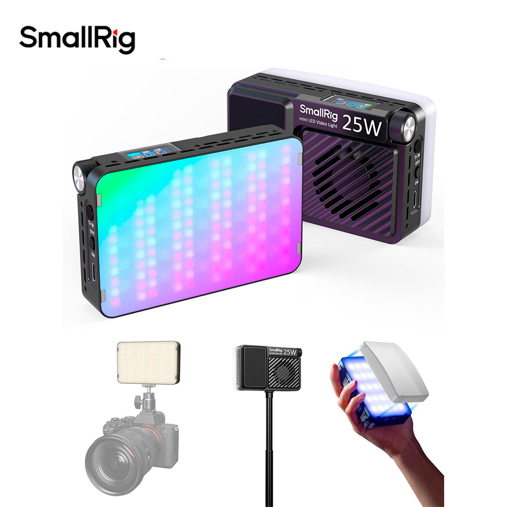 La mini luz LED de video RM 25C de SmallRig es una luz ultracompacta de 25 W y alta potencia, capaz de añadir color RGB completo a tus producciones. Es de bolsillo y cuenta con un rango de temperatura de color de 2500 a 10 000 K y 14 efectos de iluminación integrados para plasmar tu visión creativa. Un CRI de 96 y un TLCI de 99 garantizan una reproducción precisa del color de tu sujeto.